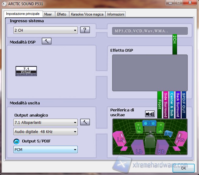 In basso a destra troviamo un’immagine interattiva dove possiamo spostare a nostro piacimento le casse del surround per avere l’effetto che più ci aggrada.