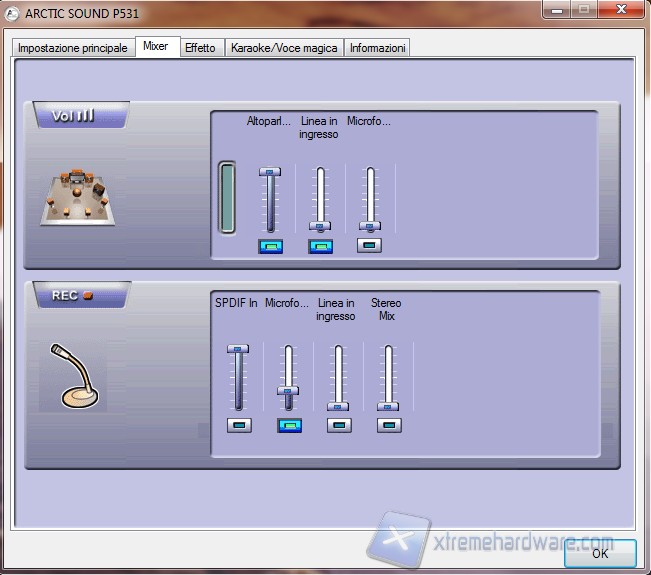 La seconda schermata, denominata mixer, ci permette di modificare il volume degli altoparlanti e del microfono; più in basso possiamo selezionare la linea sulla quale registrare.